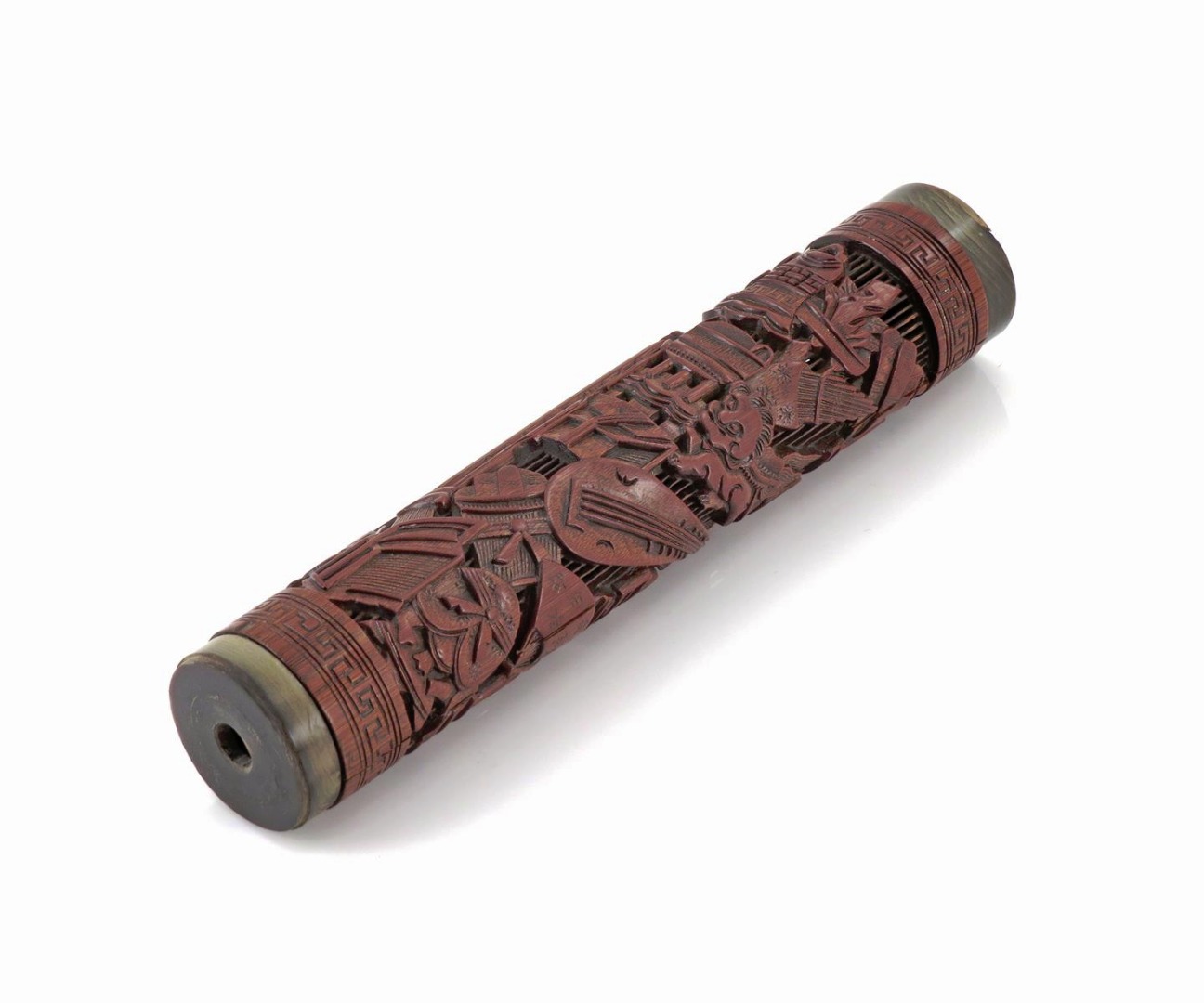 The cylindrical body carved in relief with many vases, incense burners, fans and other auspicious objects on a ground of openwork columns, all within key fret bands, the end fittings carved from buffalo horn, 19.2cm. (3)