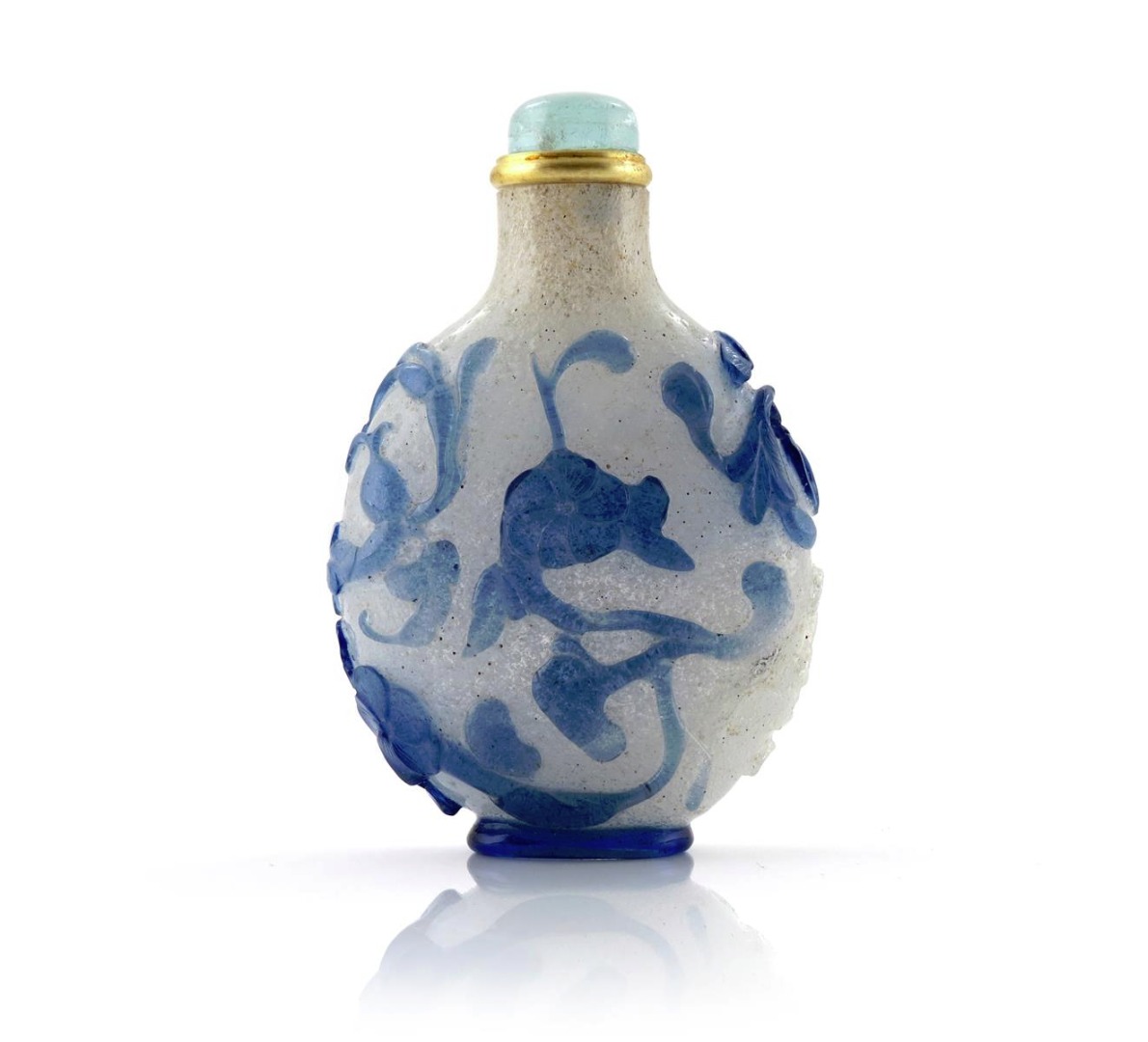 A CHINESE BLUE OVERLAY GLASS SNUFF BOTTLE 18TH/19TH CENTURY The compressed ovoid body raised on...