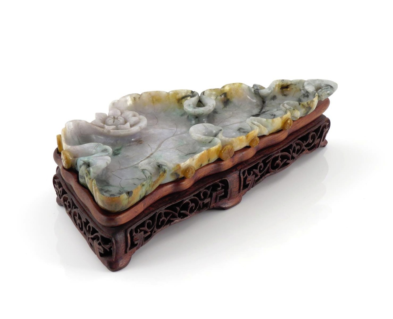 Formed as a large leaf, the edges curling inwards, a single flowerhead to one edge, the stone with green and russet mottling, raised on a fitted scrolling reticulated stand, 25.2cm. (2)