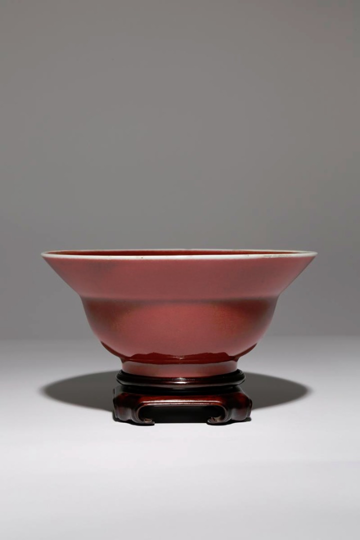 The flaring body raised on a circular foot, decorated all over with a deep red glaze, the rim with a white band, a paper label for John Sparks Ltd., raised on a fitted hardwood stand, 20.6cm. (2)
