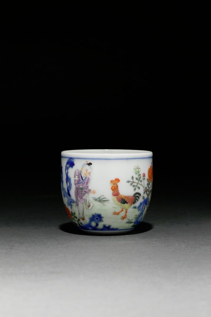 Painted to the exterior with a young boy and a cockerel with blue rockwork and peony, the reverse with a hen and her chicks below a poetic inscription, six character Qianlong seal mark, 6.6cm dia.