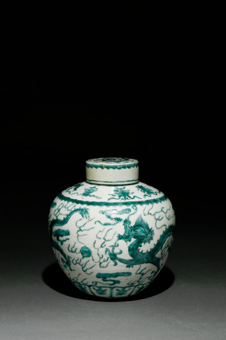 A CHINESE GREEN GLAZED OVOID DRAGON JAR AND COVER PROBABLY LATE QING Decorated with two scaly...