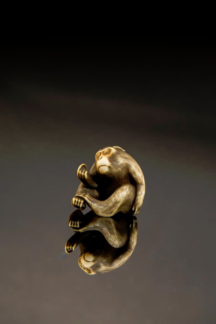 λ A JAPANESE IVORY NETSUKE MEIJI 1868-1912 Carved as a monkey examining a flea between his fingers
