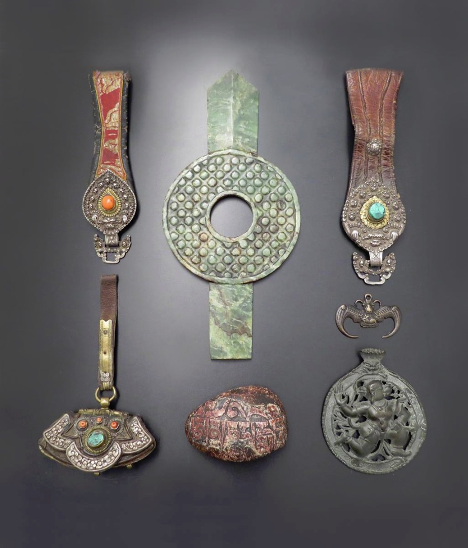 Comprising a jade bi disc, three Tibetan silver-coloured metal items, a bronze plaque, a bronze bat and a carved granite pebble, 34cm. (7)