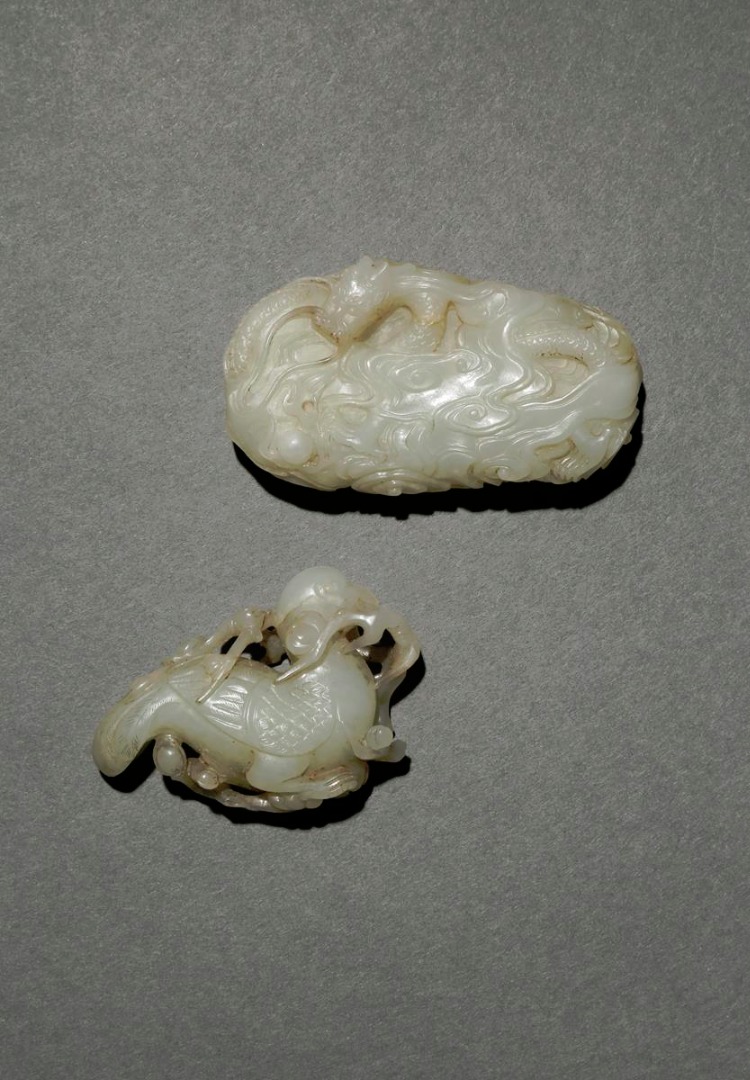 One carved as a dragon amidst clouds, the other as a bird amongst prunus, 8cm. (2)