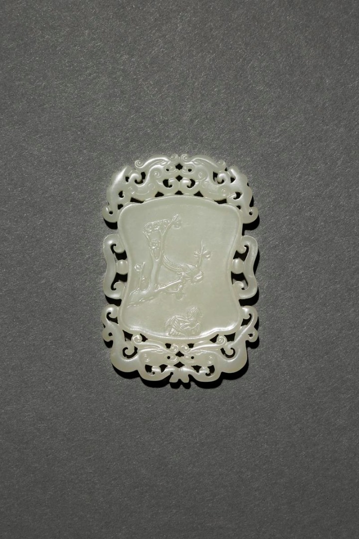 A CHINESE PALE CELADON JADE RETICULATED PLAQUE PROBABLY 20TH CENTURY Carved in relief to one...