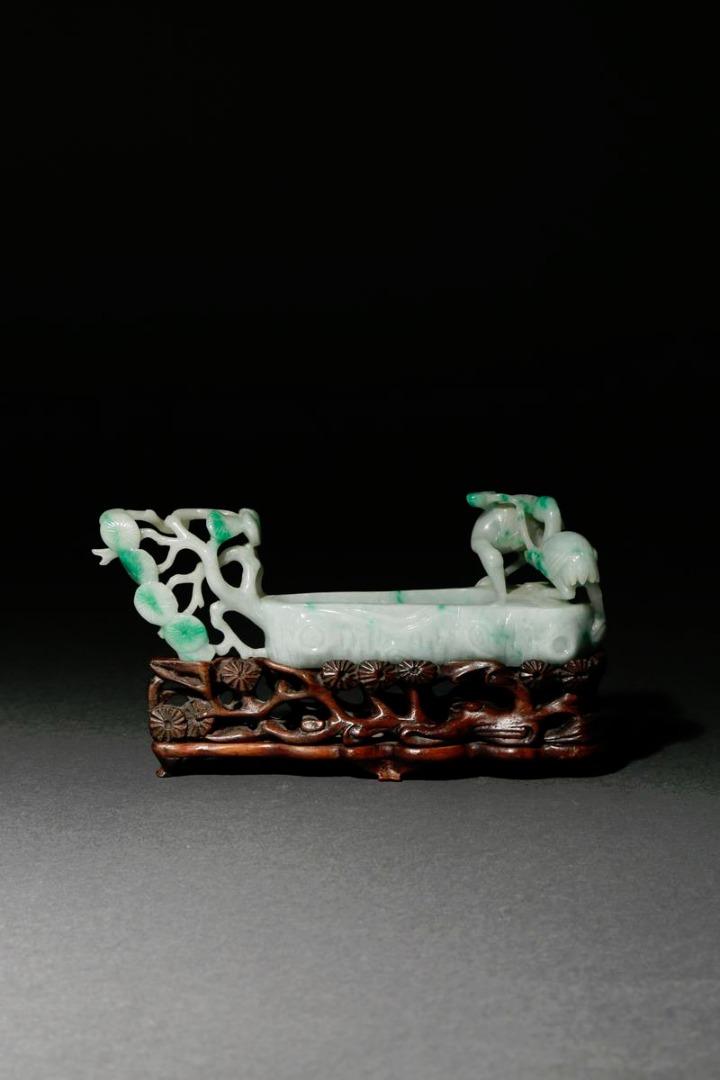 A CHINESE JADEITE BRUSH WASHER 20TH CENTURY Carved as a log with two egrets to one end