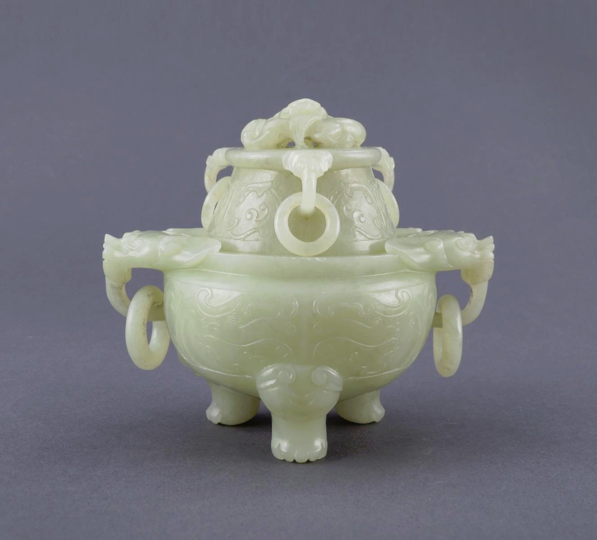 The compressed circular body carved in relief with taotie masks and with two dragon head handles, each supporting a loose ring, all supported on three lion dog mask feet, the cover with further loose rings, the finial formed as a sinuous curled chilong, 11.2cm. (2)