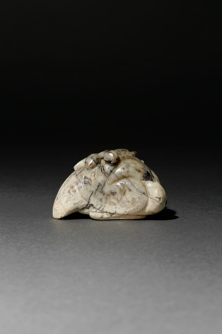 A CHINESE CALCIFIED JADE CARVING OF A CRANE LATE QING DYNASTY Sitting with its head turned and...