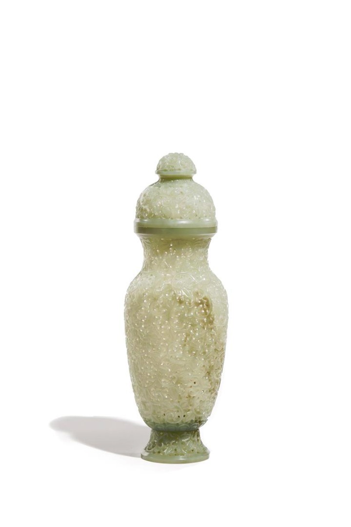 A CHINESE CELADON JADE RETICULATED VASE AND COVER 20TH CENTURY The body intricately carved with...