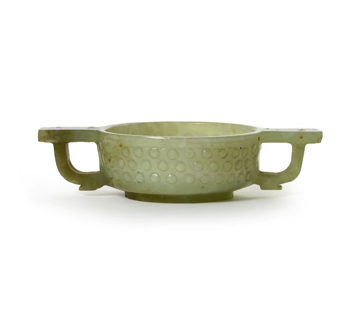 A SMALL CHINESE CELADON JADE TWO-HANDLED CUP QING DYNASTY The compressed circular body with a...