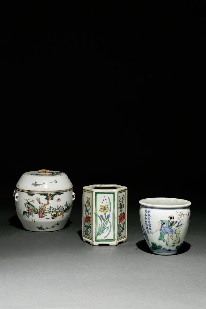 Painted with figures in a fenced garden with rockwork, with two columns of calligraphy, together with a hexagonal famille rose bitong painted with panels of foliate sprays, and a pot and cover painted with boys engaged in outdoor pursuits, 14cm max. (4)