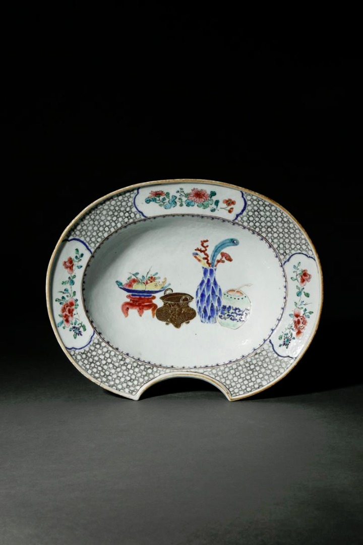 A CHINESE FAMILLE ROSE BARBER'S BOWL 18TH CENTURY Painted with an incense burner