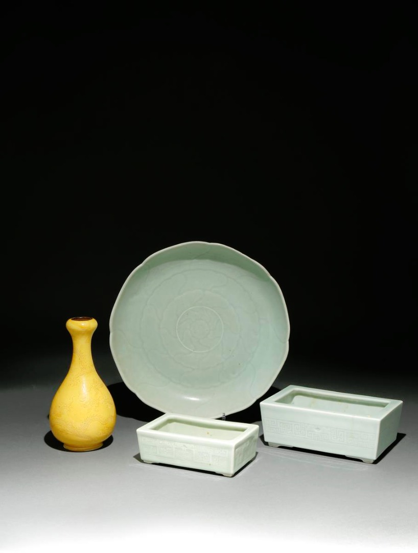 One a lobed dish, modelled as a flowerhead with radiating petals, the other two rectangular jardinières, each with a key fret band to the exterior, together with a yellow glazed garlic-neck bottle vase, incised with two five-clawed dragons and a flaming pearl of wisdom, the latter three each with a Qianlong mark, 35cm max. (4)