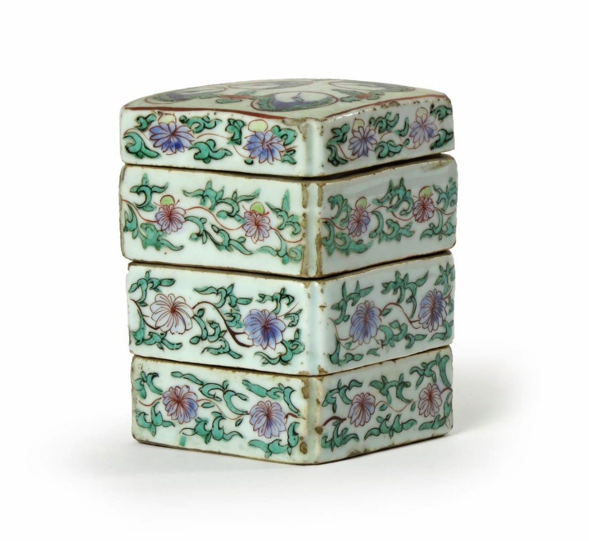 A CHINESE WUCAI SQUARE SECTION TIERED BOX AND COVER 17TH CENTURY Formed in four sections