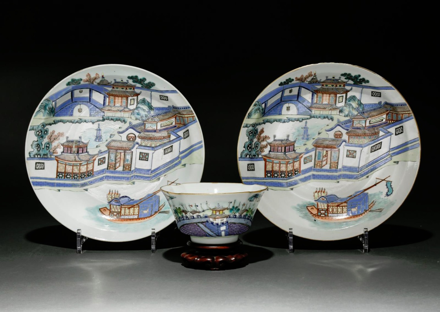 A PAIR OF CHINESE FAMILLE ROSE DISHES LATE QING DYNASTY Each painted with pagodas and gardens...