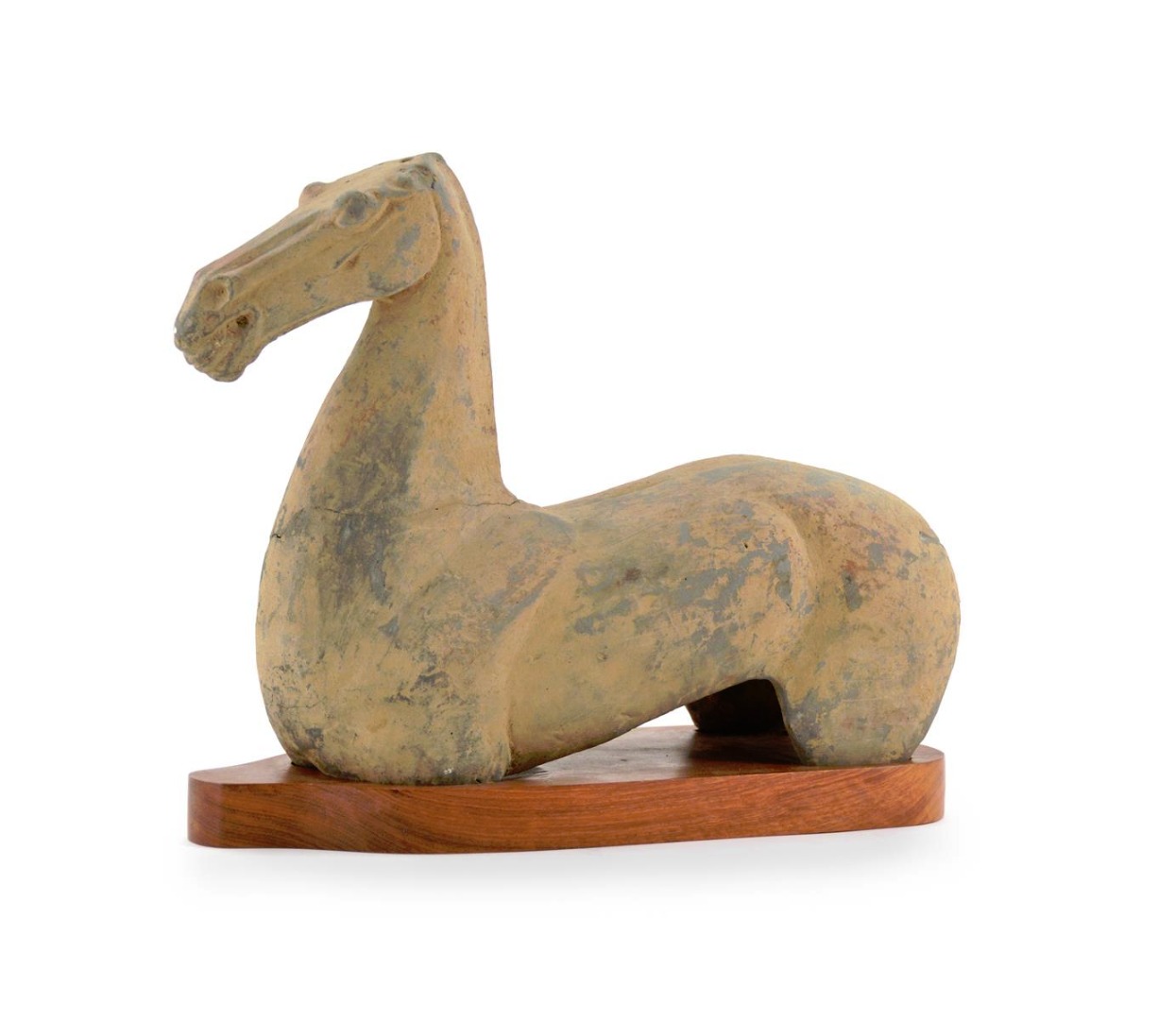 Facing forward, with traces of earth pigments, a modern wood stand, 41cm. (2)