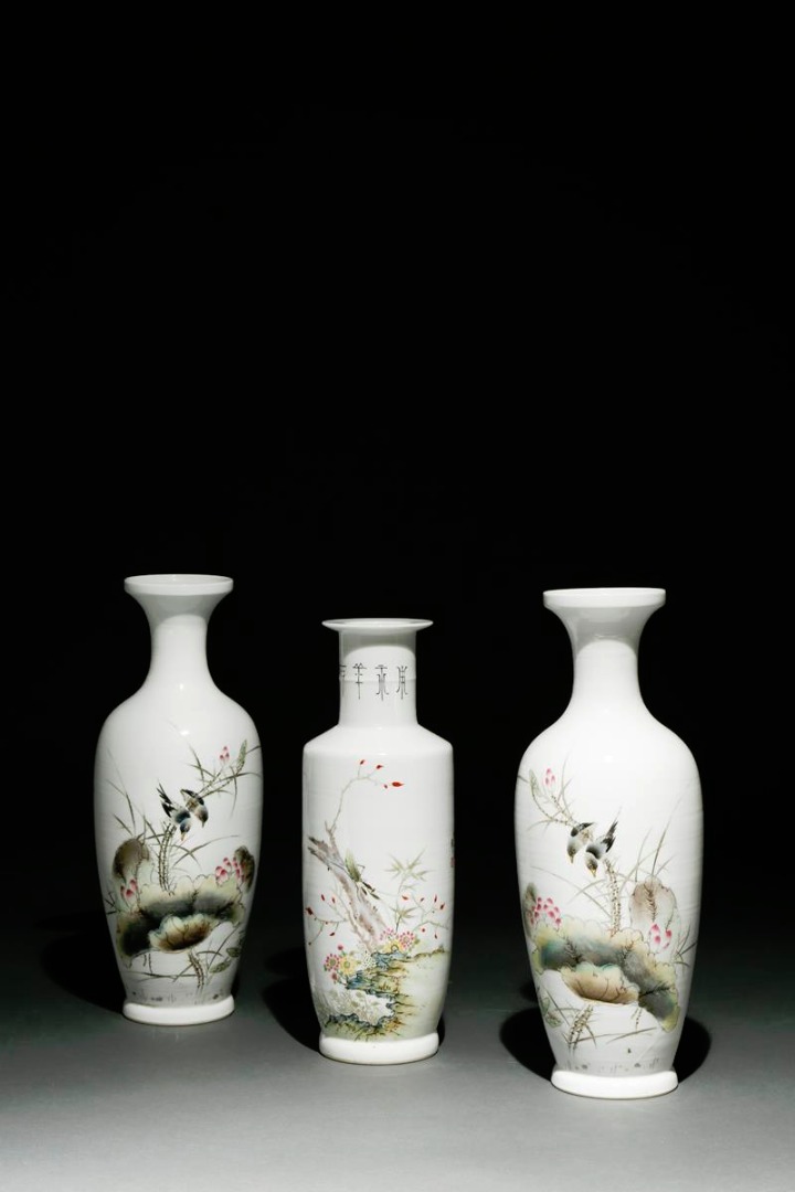 THREE CHINESE FAMILLE ROSE VASES PROBABLY REPUBLIC PERIOD A pair painted with birds and lotus