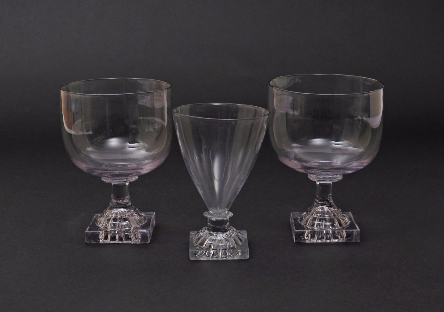 A pair of English rummers c.1800, with large rounded funnel bowls raised on square lemon squeezer bases, and a third smaller, 16cm max. (3)
