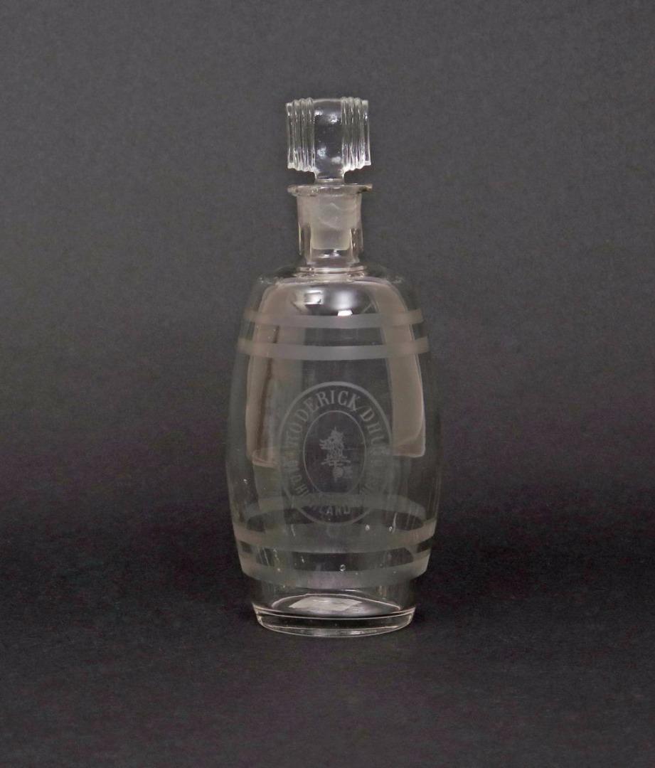 A Scottish whisky decanter and stopper late 19th century, of barrel shape and engraved with a logo for Roderick Dhu Old Highland Whiskly, the stopper formed as a whisky barrel, 23cm. (2)