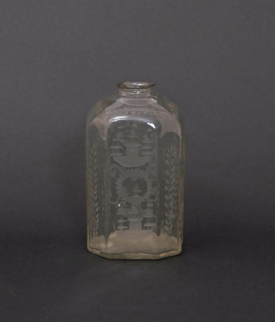 A Bohemian glass flask c.1740, of chamfered rectangular form, engraved with stylized ships between floral and foliate motifs, 15.5cm.