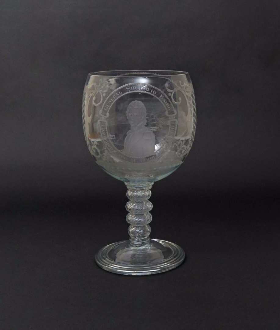 A massive commemorative glass goblet 19th century, the rounded bowl engraved with a titled portrait of General Sir David Baird, underneath inscribed 'Captured Cape of Good Hope 1806', the reverse with a three-masted ship at sea, raised on a moulded multiple knop stem, 35cm.