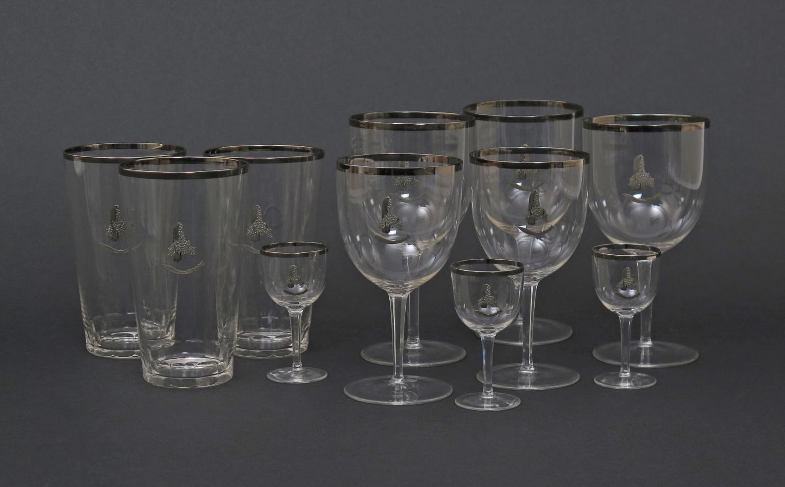 A suite of military glass 20th century, onlaid in silver with a kukri below an elaborate dress helmet, probably relating to the Nepal Army. Comprising: ten beakers, ten red wine glasses, six white wine glasses, and eleven liqueur glasses. (37)