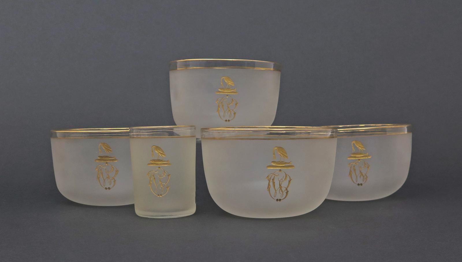 Four armorial glass fingerbowls late 19th/early 20th century, and a small beaker, all engraved and richly gilded with the crest of an egret standing atop a dead fish, above the monogrammed initials CW, 12cm max. (5)