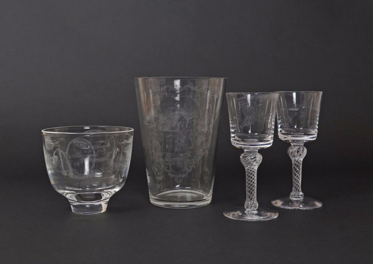 An Edinburgh Crystal vase 20th century, the flared bucket form engraved by William McLaren with a cartouche enclosing the name Kathleen Wheston and the dates June 5th 1939-1960, the company name RPG Ltd to one side, a smaller glass vase showing a view of Aline Lodge on the Isle of Lewis, titled 'James Denison-Pender 1992' but also engraved 'Steinberg' beneath the foot, and a pair of goblets perhaps also by Denison-Pender, stipple engraved with a leopard, the other with a farmer and horses, 20.5cm max. (4)