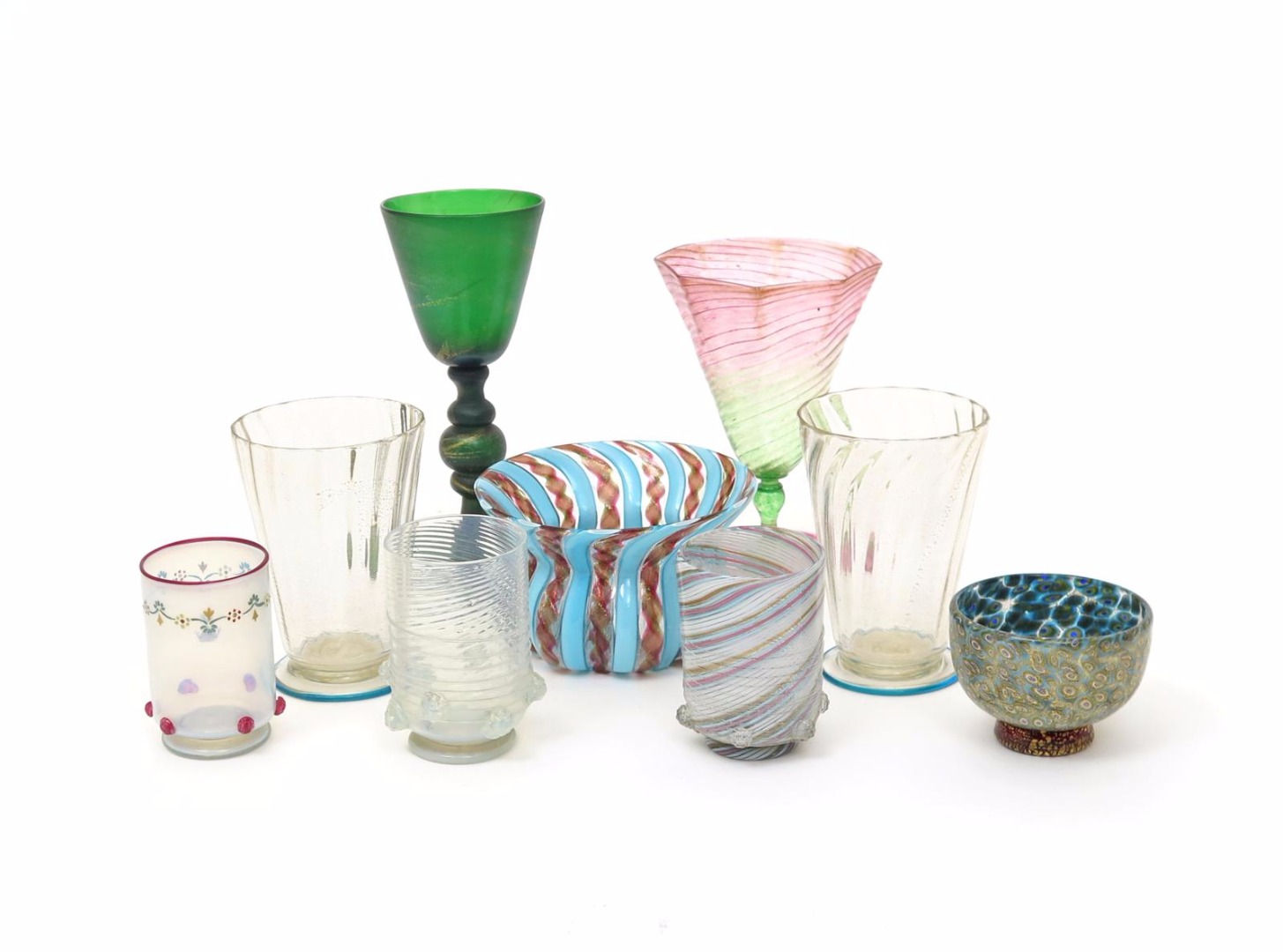 A small collection of Venetian glass 19th and 20th centuries, including a Salviati lobed bowl with everted rim, striped in pale blue and gilt and red aventurine, a small millefiori bowl in shades of blue and gilt, a pair of moulded beakers with blue line footrims, three small rounded beakers applied with raspberry prunts, a spiral-moulded octagonal goblet in pink and green, and a green glass raised on a multiple knopped stem, 18cm max. (9)