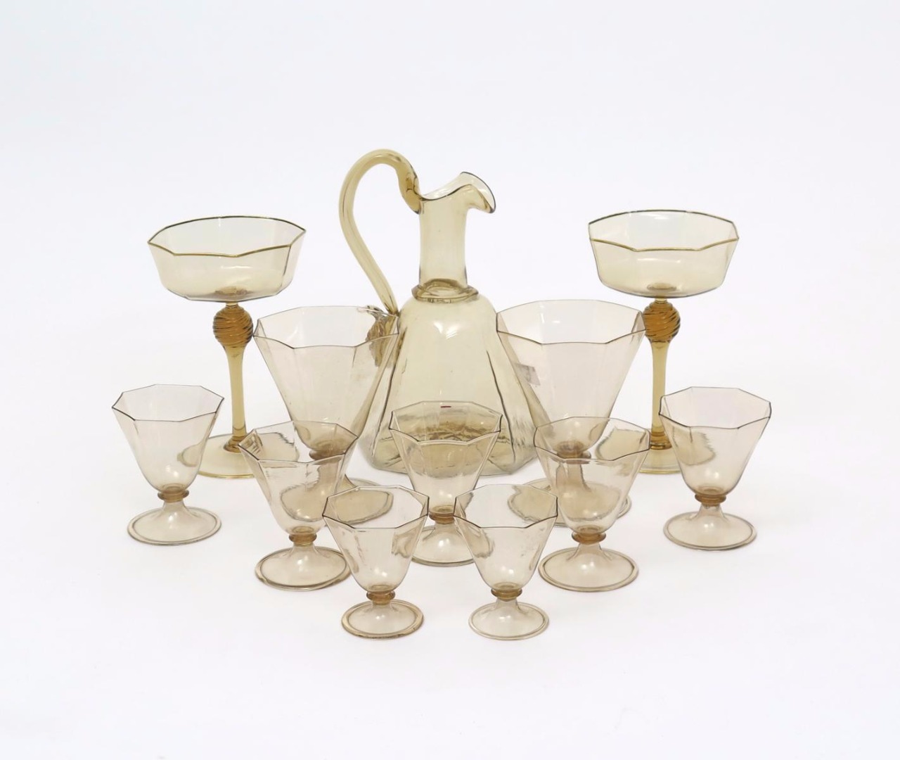 A suite of Salviati glass 20th century, the octagonal forms of a smoky amber colour. Comprising: a jug, five rummers, six wine glasses, five liqueur glasses and two associated cocktail glasses. (19)