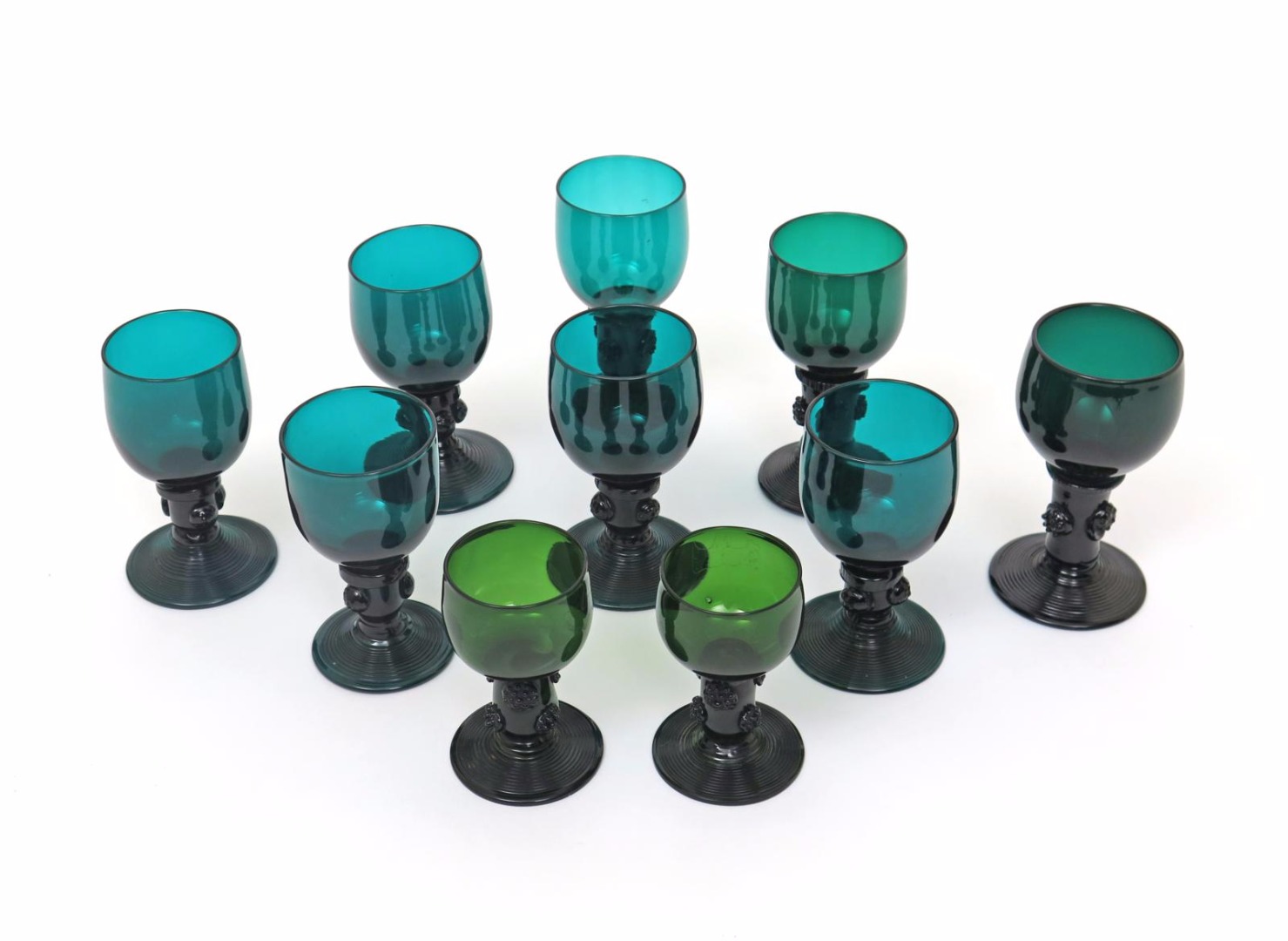Ten English green wine glasses c.1760, the rounded bowls raised on short stems applied with raspberry prunts above trailed feet, 12.3cm max. (10)