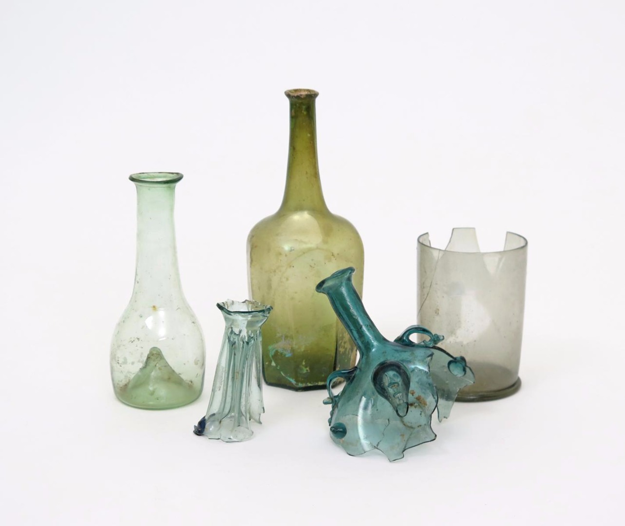 A Waldglass late medieval apothecary bottle 14th/15th century, the slender form of a pale green tone and with a high kick-in base, a Dutch octagonal bottle flask, an early beaker, and two kuttrolf fragments of a blue tone, damages, 19.2cm max. (5)