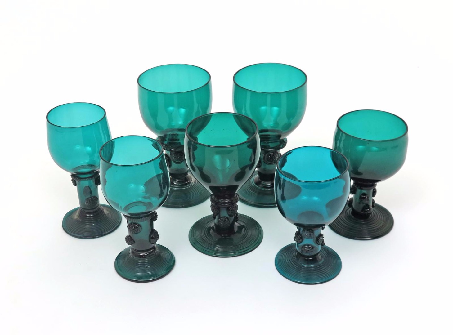 Seven English green wine glasses c.1760 and later, with rounded bowls raised on short stems applied with raspberry prunts, above trailed and folded feet, of varying size and tone, 13.8cm max. (7)