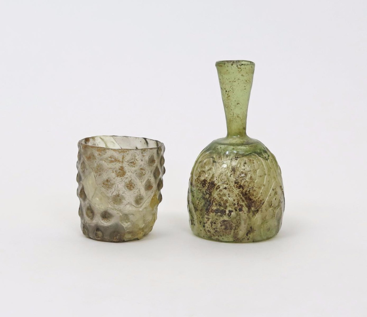 A Persian free-blown glass bottle 12th/13th century, the rounded body impressed with panels of stylized grapes, with tall flared neck, and a 17th century Dutch glass beaker with pineapple type moulding, damages and repairs, 15.2cm max. (2)