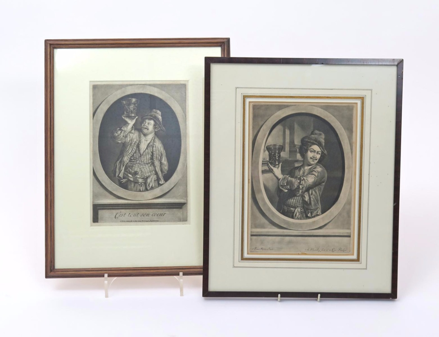 Four glass related prints 18th century, two of Dutch gentlemen holding drinking glasses aloft, one by Abraham Blooteling after Jan van Mieris, the other by Jacob Gole and titled 'Cest tout son coeur', one after Annibale Caracci 'The Arts of Bologna', with a glassmaker peddling his wares, and a page from a German book, showing glass engravers, all within glazed wood frames, 42.5cm max. (4)
