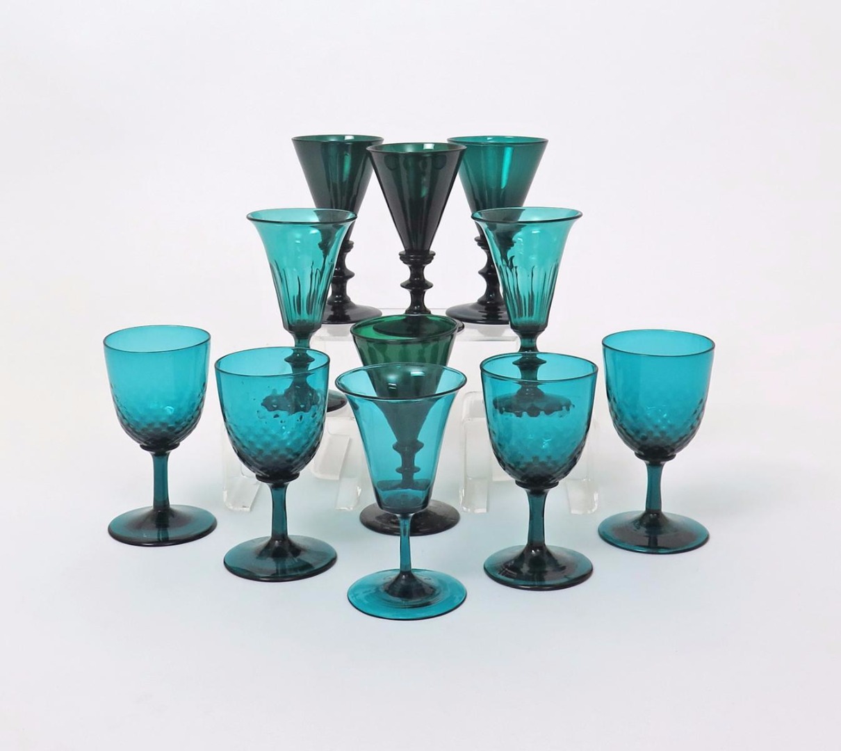 Eleven green wine glasses late 18th/19th century, four with rounded hammered bowls on slender plain stems, four with flared bowls on double knopped stems, one on a narrow stem, two with polished facets on short stems, 13.4cm max. (11)