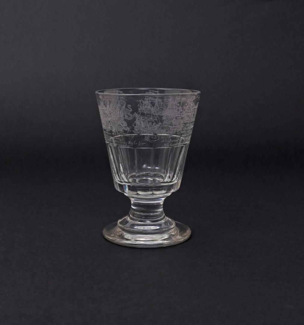 A rare engraved commemorative rummer dated 1853, the flared bucket bowl engraved in detailed diamond point by Thomas Sutherland of London, with two Royal coats of arms, one above the initials JW, with a ship, a coach and horses, a paddle steamer titled Queen, a view of Windsor Castle, and two poems, engraved with the date 1853, 14cm.