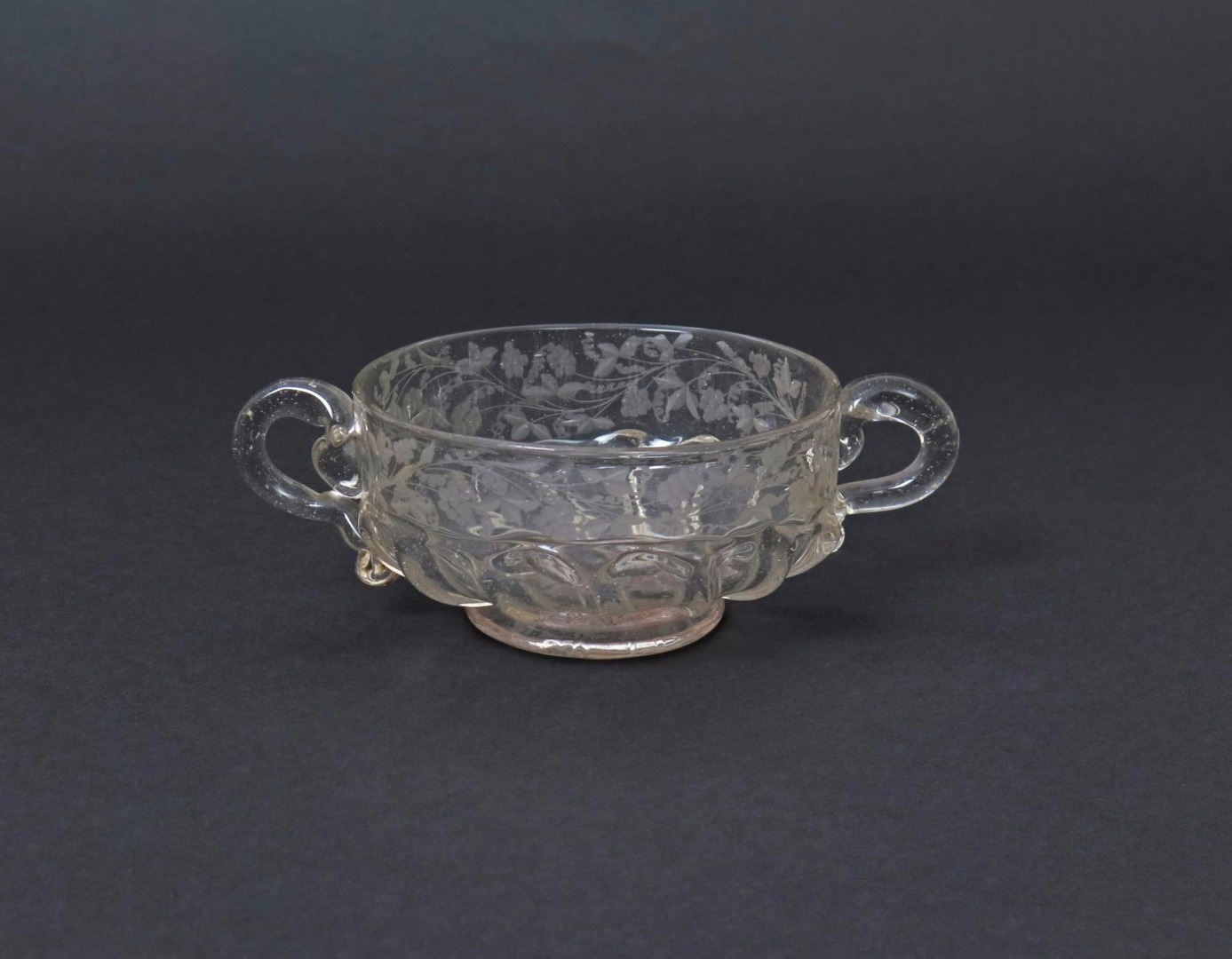 A glass two-handled porringer early 18th century, the shallow bowl with moulded gadrooning beneath an engraved band of grapevine, 18cm.