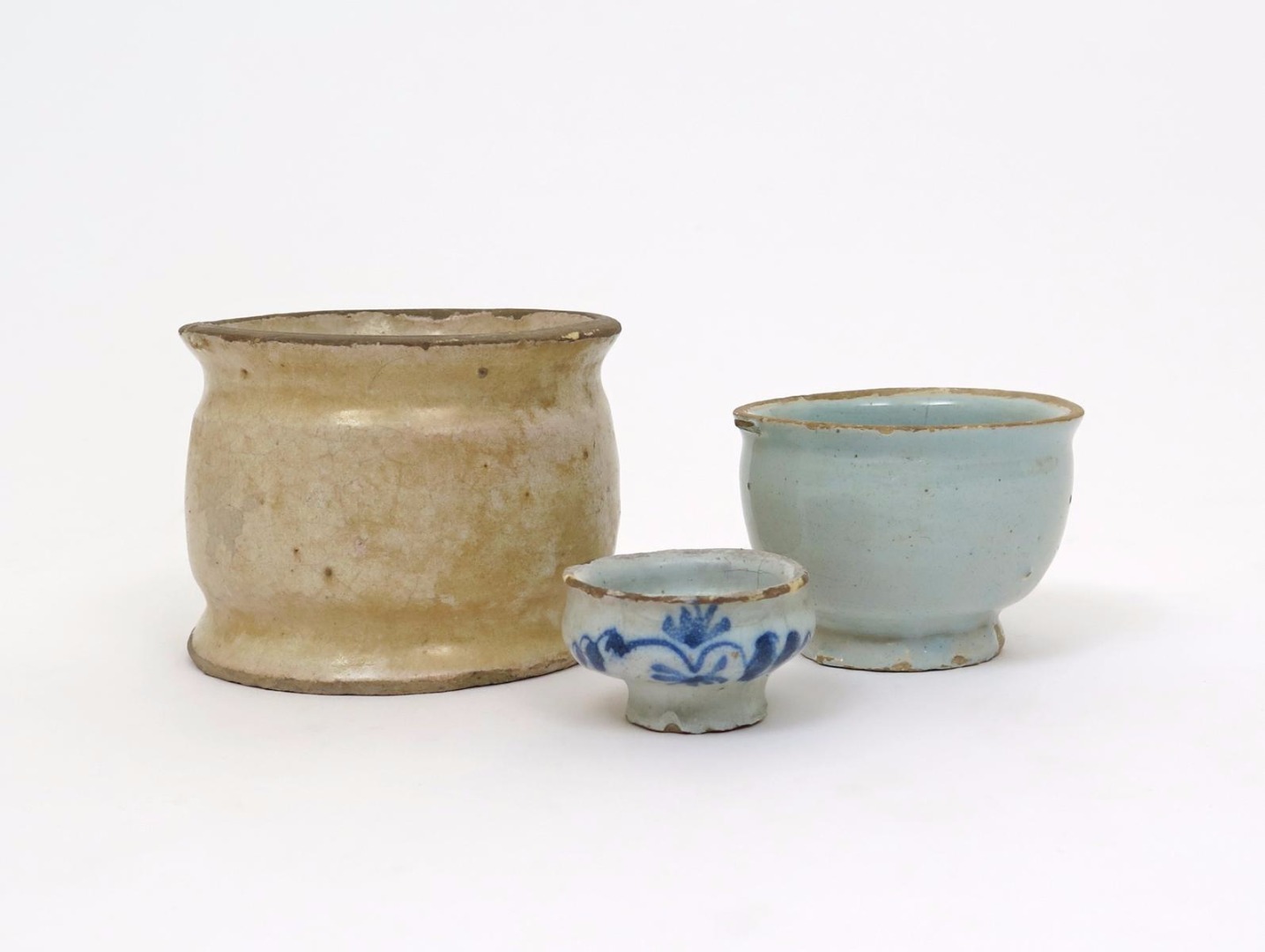 Three delftware ointment pots or apothecary jars late 17th/18th century, one of squat albarello form decorated in a white glaze, one rounded and raised on a low foot, the smallest with a blue foliate motif, minor damages, 7cm max. (3)