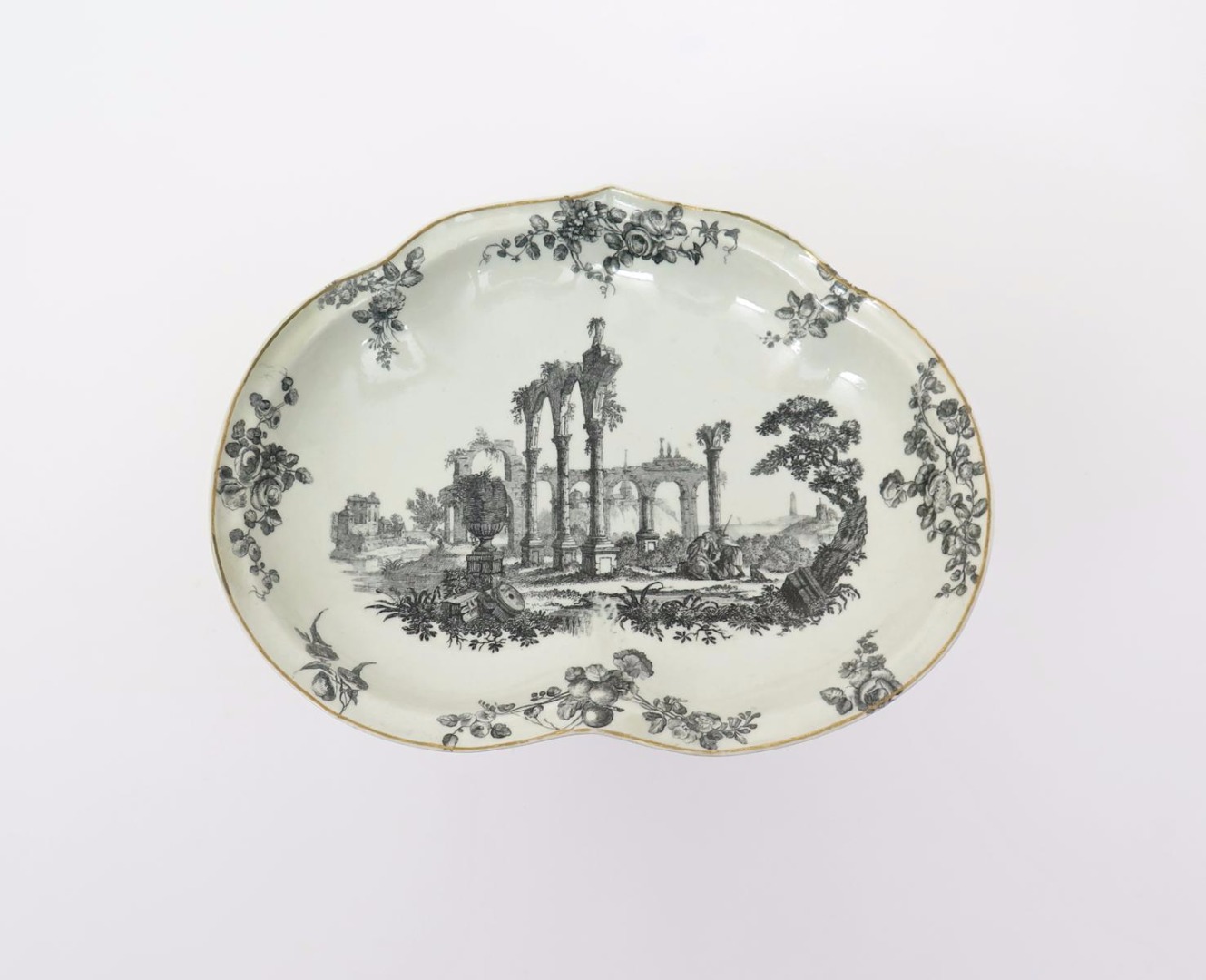 A Worcester dessert dish c.1770-75, printed in black with an unknown scene of two figures seated beneath Classical ruins, the rim with arrangements of fruit and flowers, a little restoration to the rim, 25.8cm.