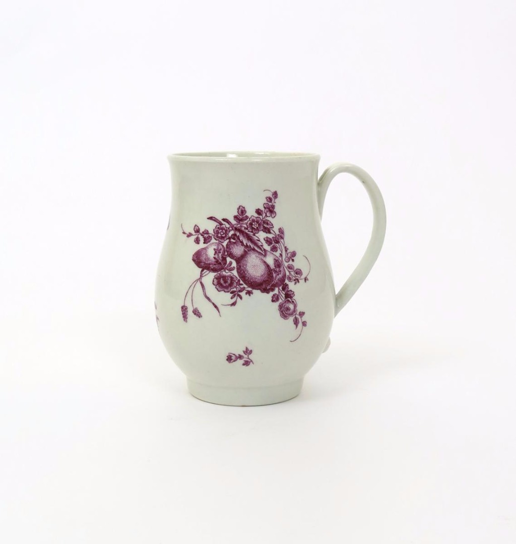 A Worcester bell-shaped mug c.1765, printed in puce monochrome with sprays of fruit and flowers, including pear, apple and gooseberry, with a grooved strap handle, 11.8cm.