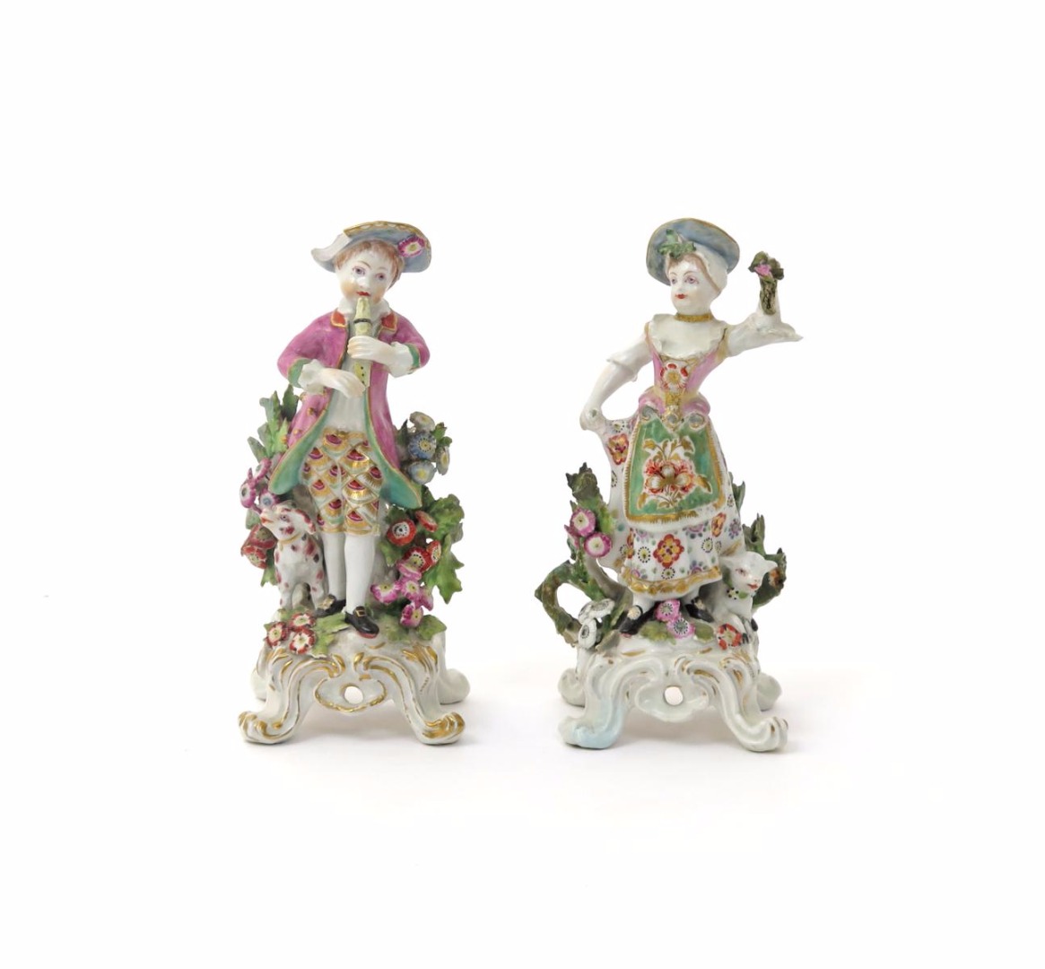 A pair of Bow figures of musicians c.1770, he playing the flageolet, she dancing beside a lamb, both before flowering bocage, red anchor and dagger marks, damages and repairs, 18cm. (2)