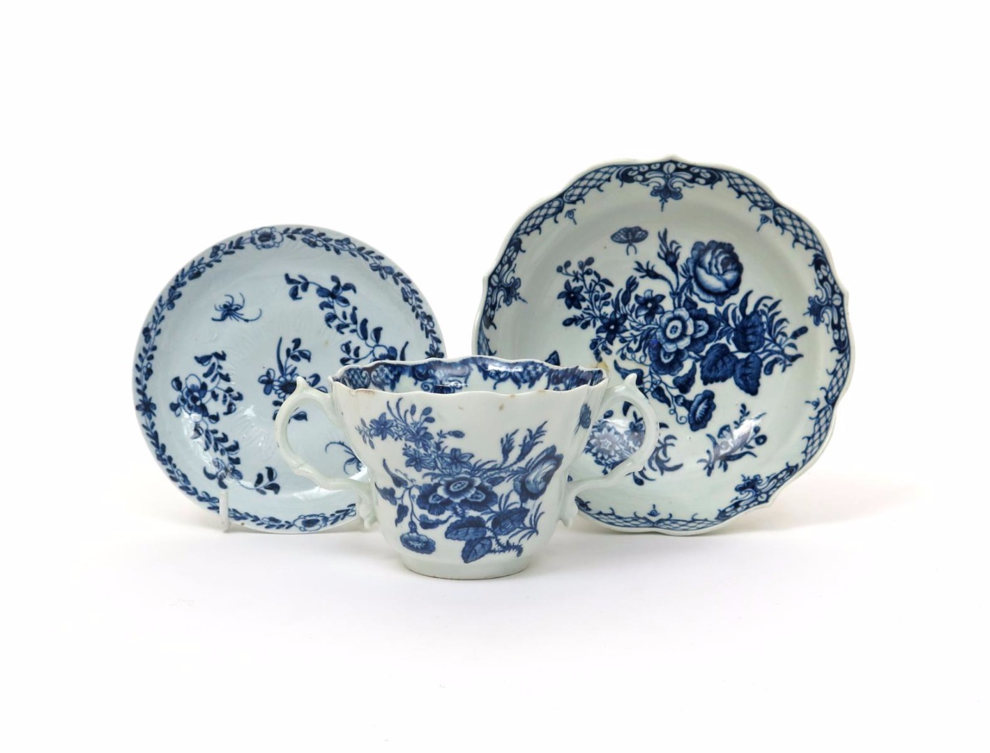 A Worcester blue and white chocolate cup and saucer c.1765, of ogee form, printed with the Three Flowers pattern, hatched crescent marks, and a Richard Chaffers (Liverpool) saucer, lightly moulded with a foliate design and painted with flowering sprays, 14.5cm max. (3)