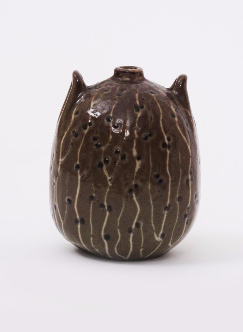 A Martin Brothers stoneware gourd vase by Edwin & Walter Martin, dated 1906, ovoid form with pulled handles, incised with vertical ribs glazed brown with blue spots incised 1906 Martin Bros London & Southall 5cm. high