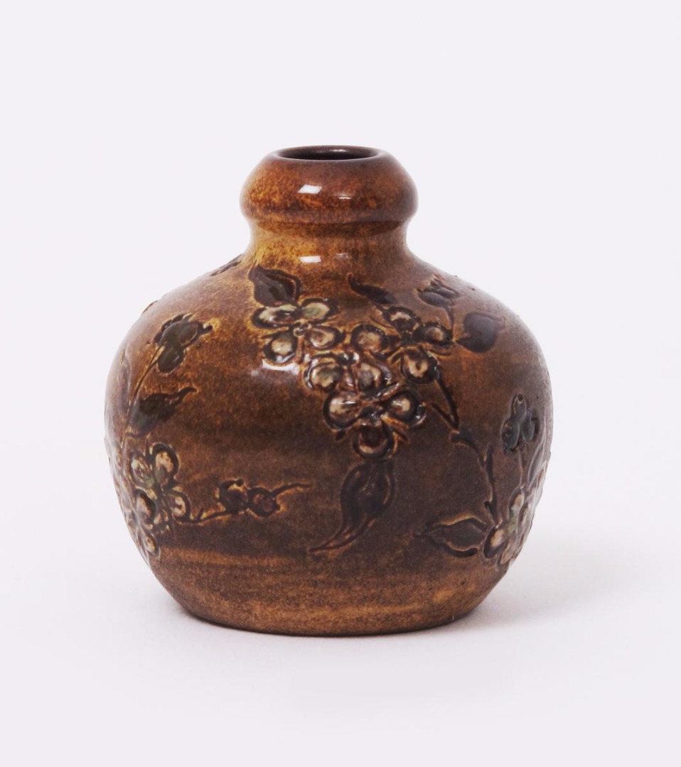A Martin Brothers stoneware miniature vase by Edwin & Walter Martin, dated 1902, ovoid, incised and painted with flowers and foliage in brown and white on a brown ground incised 12-1902 Martin Bros London 5cm. high