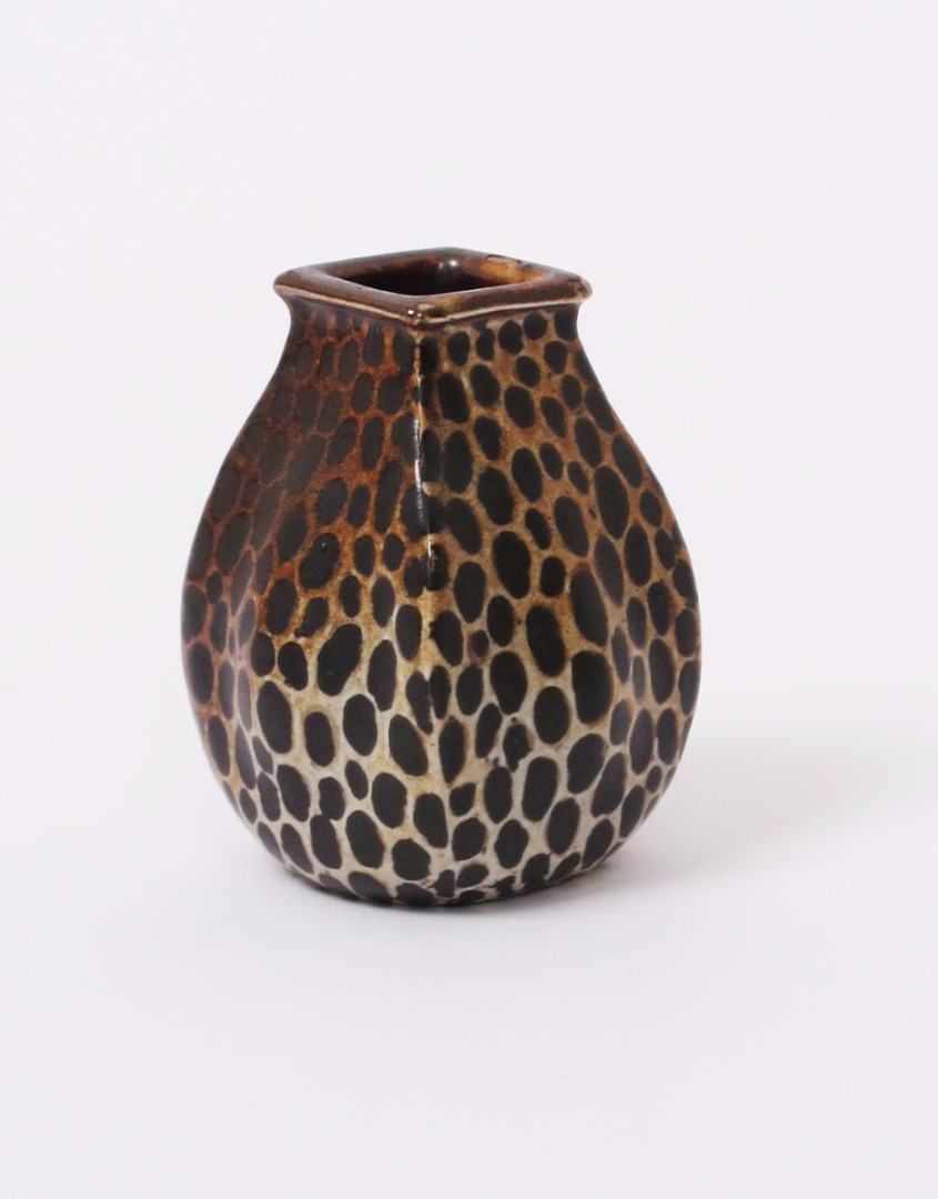 A Martin Brothers stoneware gourd vase by Edwin & Walter Martin, dated 1907, swollen square section with square rim, painted with manganese spots on a mottled brown ground incised 3-1907 Martin Bros London & Southall 8cm. high