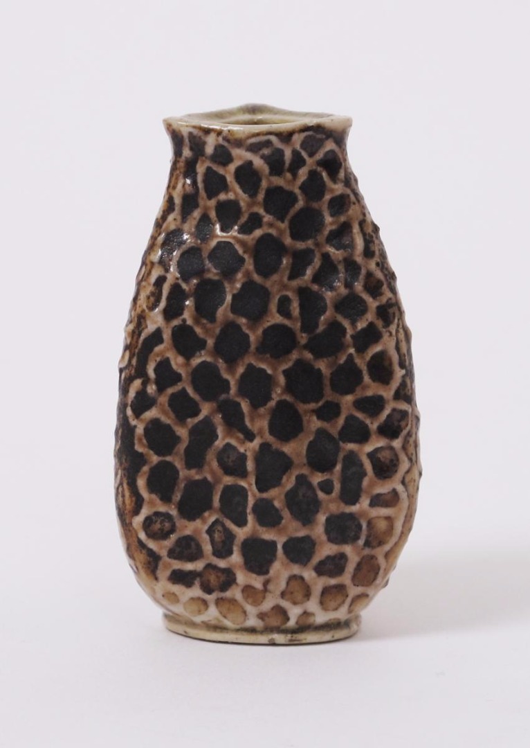 A Martin Brothers stoneware gourd vase by Edwin & Walter Martin, dated 1902, swollen form tapering to triangular rim, modelled with veins, glazed brown and olive incised 2-1902 Martin Bros London & Southall 7cm. high