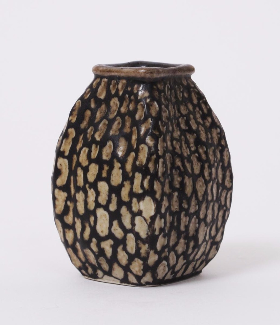 A Martin Brothers stoneware gourd vase by Edwin & Walter Martin, dated 1907, swollen square section, glazed umber with mushroom spots incised 1907 Martin Bros London & Southall 6.5cm. high