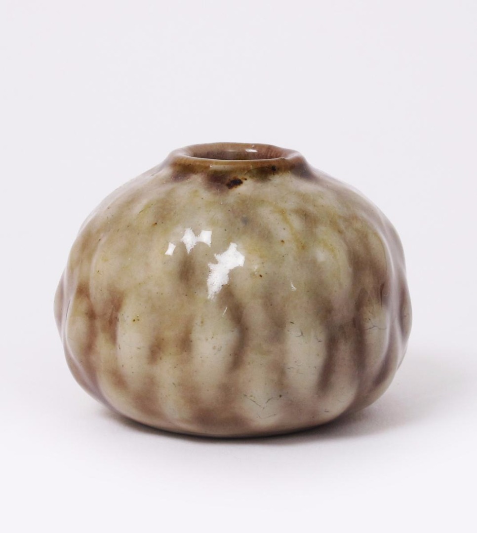 A Martin Brothers stoneware gourd vase by Edwin & Walter Martin, dated 1909, the ovoid body with modelled surface, covered in a pale off white glaze over umber, incised 11-1909 Martin Bros London & Southall 5cm. high